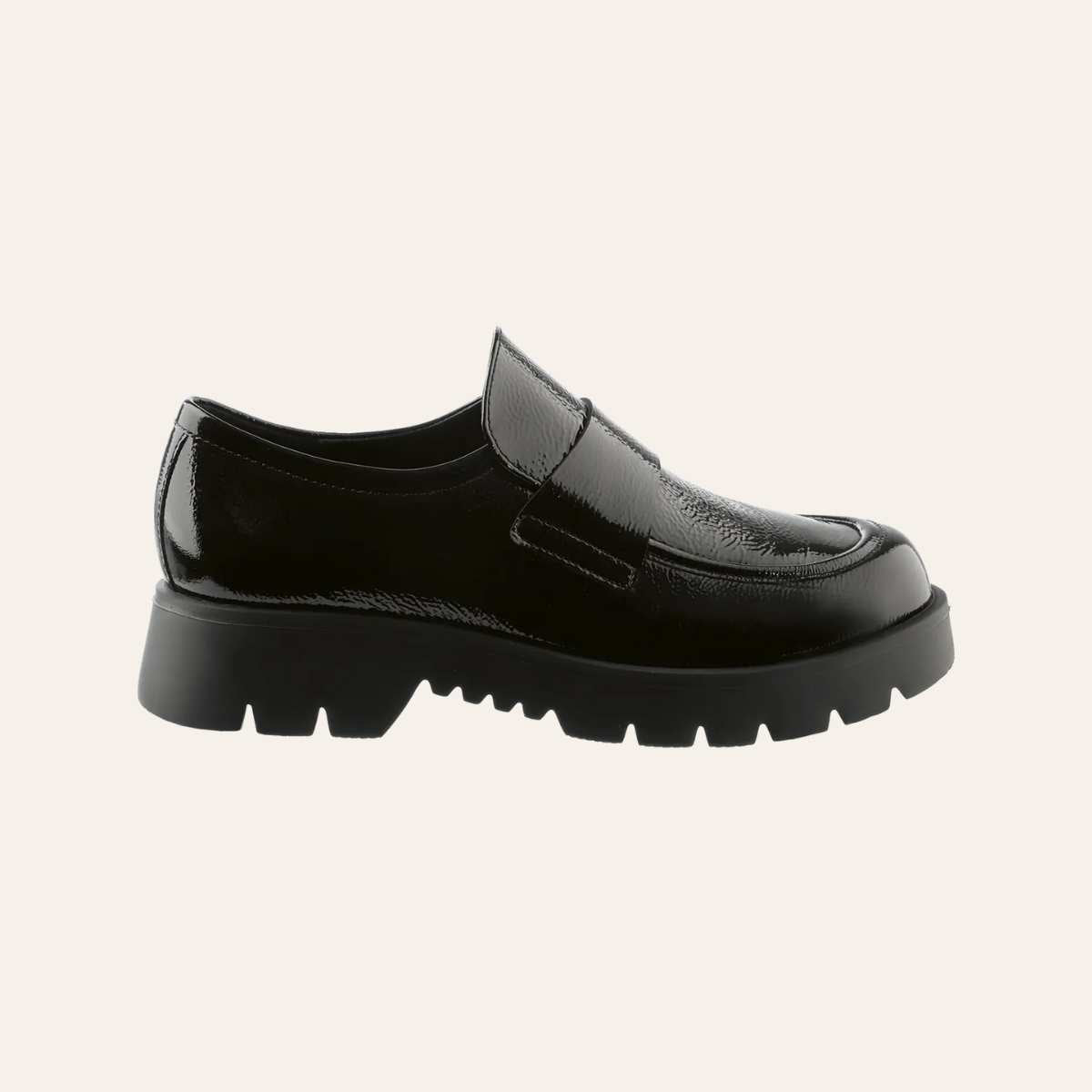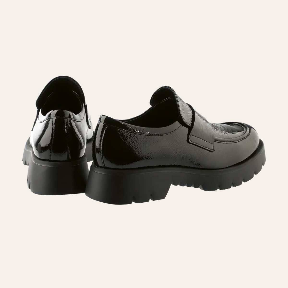 Den minimalistiske silhuetten til Høgl sine svarte loafers "Finn" kombinerer materialer av høy kvalitet med fantastisk komfort – og sko laget i Europa. Disse myke Högl-loafersene er laget av et blankt skinn med lett krøllet effekt som gir et subtilt, men markant uttrykk. De kraftige, mønstrede og sklisikre yttersålene fullfører designet.