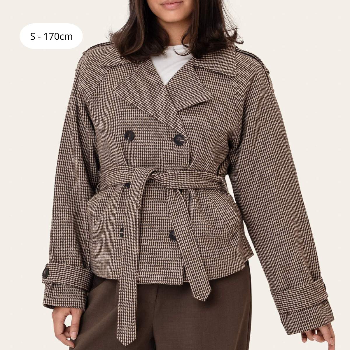 Elegant kort trenchjakke med en tidløs silhuett. Designet har dobbeltspent front, knytebelte i midjen og knappede mansjettdetaljer for et raffinert utseende. Strukturerte skuldre og rene linjer gir et feminint og sofistikert preg, mens den korte lengden gjør den ideell for overgangssesongene. Laget av et brunrutete stoff.