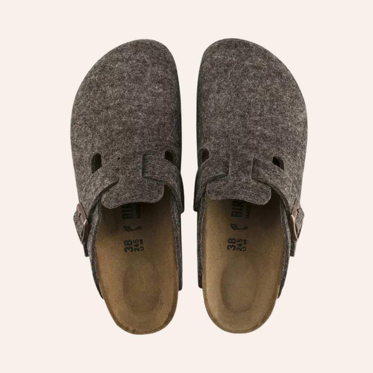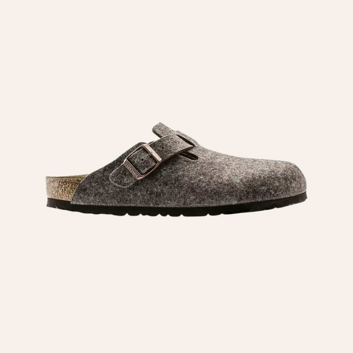 Denne versjonen av Boston-treskoen, en klassisk Birkenstock-modell, kommer med et skaft i myk ullfilt av høy kvalitet. Treskoen kan tilpasses alle føtter takket være stroppen på den øvre kanten på skaftet og den robuste metallspennen.