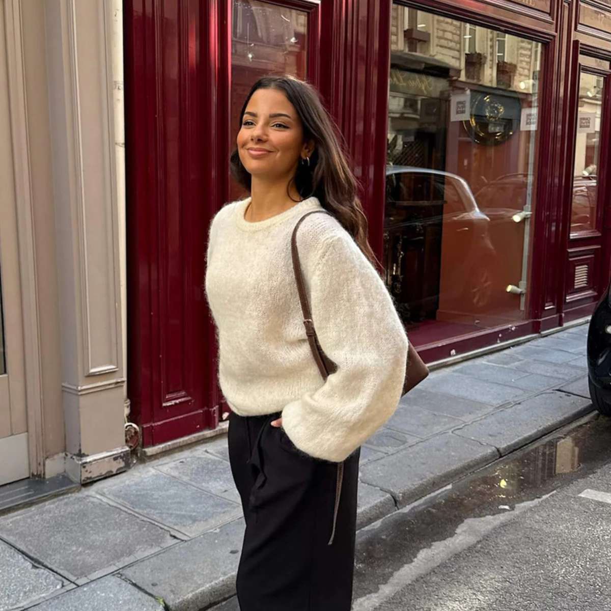 En myk og luksuriøs mohair-genser med lange ermer, lett puffet med smale ribbestrikkede mansjetter. Genseren har rund hals og fine ribbekanter både nederst og rundt halsen, som gir et elegant og raffinert uttrykk.