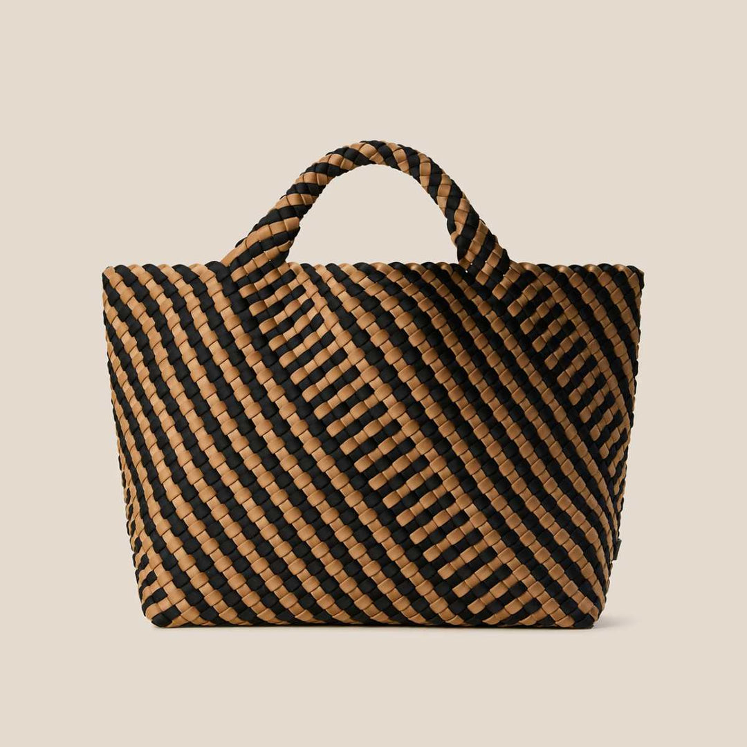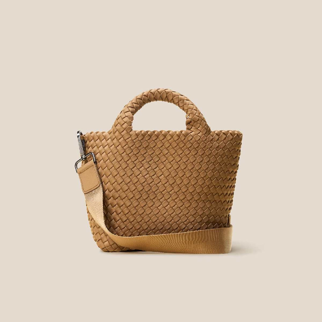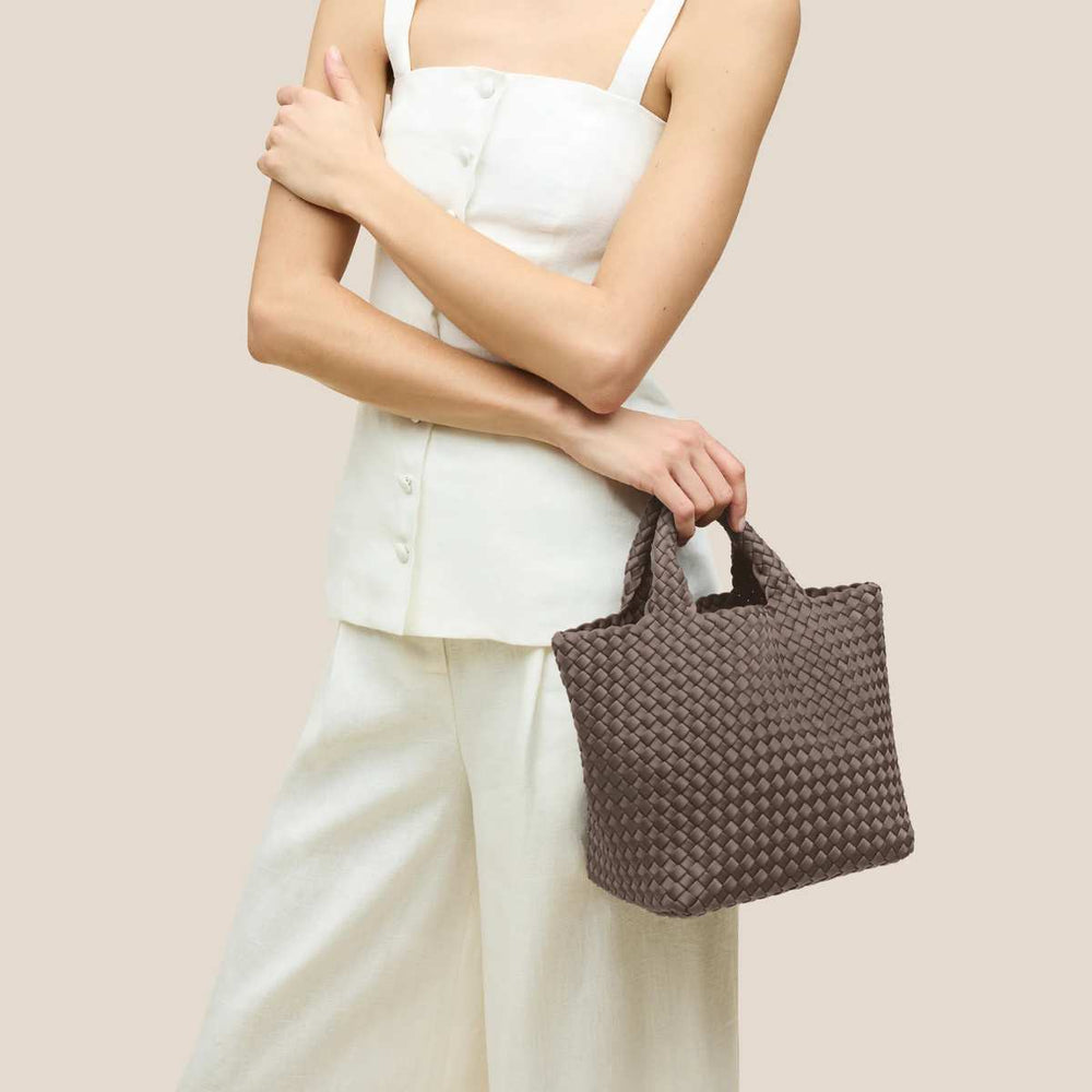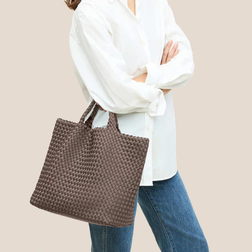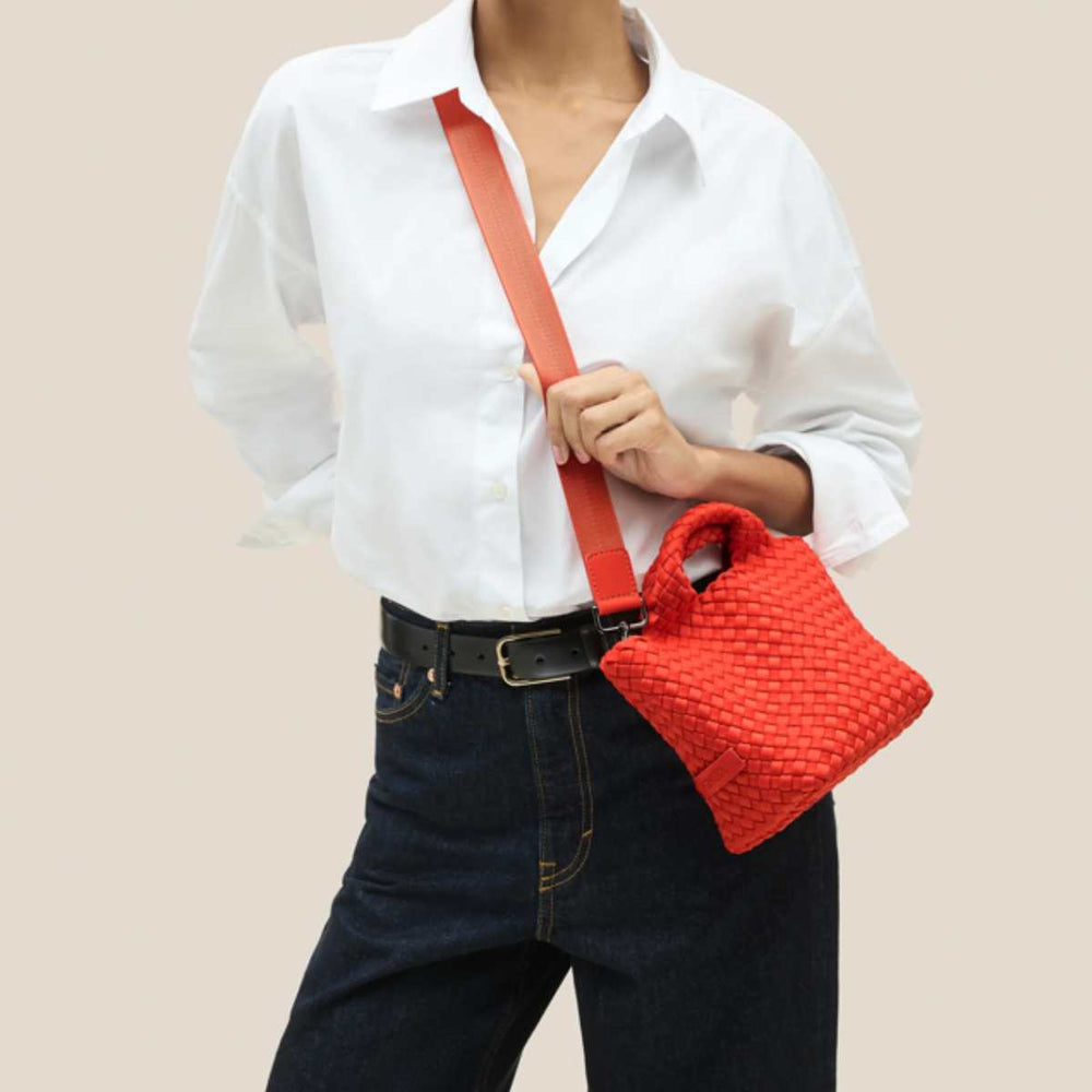 Naghedi-veskene er kjent for sitt karakteristiske vevde mønster, laget av slitesterke, vannavstøtende materialer. Grunnleggeren, Sara Naghedi, ønsket å skape et spennende alternativ til de klassiske skinnveskene, og kom med en helt genial idé: håndvevde vesker laget av neopren.