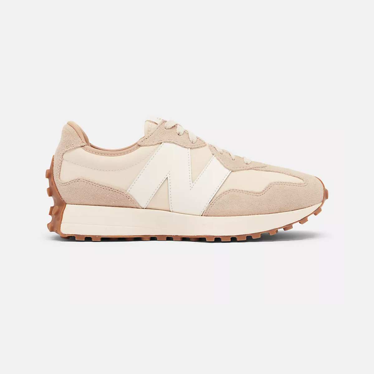 Med en kantet nytolkning av den velprøvde kileformede silhuetten, overdimensjonert og asymmetrisk plassert N-logo, samt en omsluttende yttersåle med grovt mønster inspirert av terrengløping, representerer 327 en fullstendig nytenkning av New Balance sin løpearv.