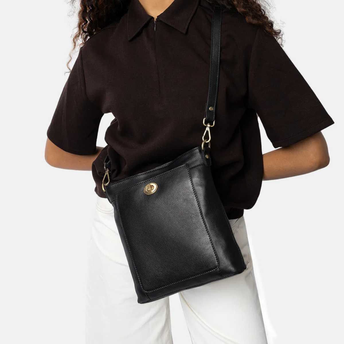 Moa Small er en stilig crossover-veske med et elegant og moderne design. Den har en dekorativ detalj på forsiden med et gullfarget spenne som gir vesken et sofistikert preg. Det romslige hovedrommet har god plass til dine hverdagsnødvendigheter – perfekt for deg som er mye på farten.