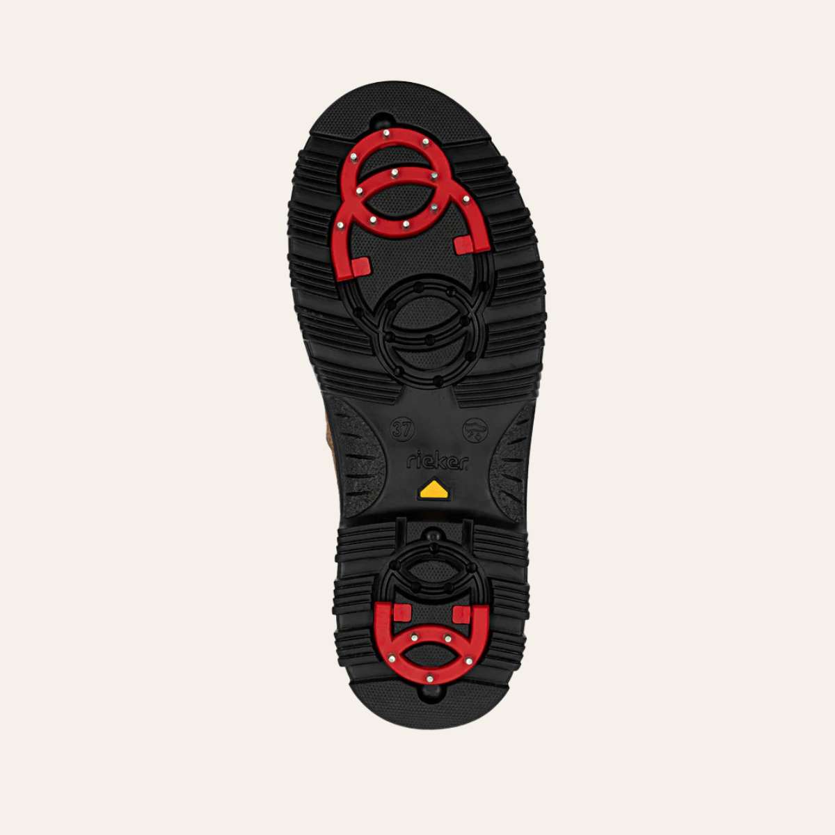Yttersålen er laget av sklisikkert TR-gummi med et godt mønster og har vendbare pigger. Når du ikke trenger piggene, kan de enkelt vendes inn i sålen, slik at du får en vanlig gummisåle. For ekstra grep på isete underlag, kan du enkelt sette piggene ut med den medfølgende plastnøkkelen (som lett kan festes til et nøkkelring).