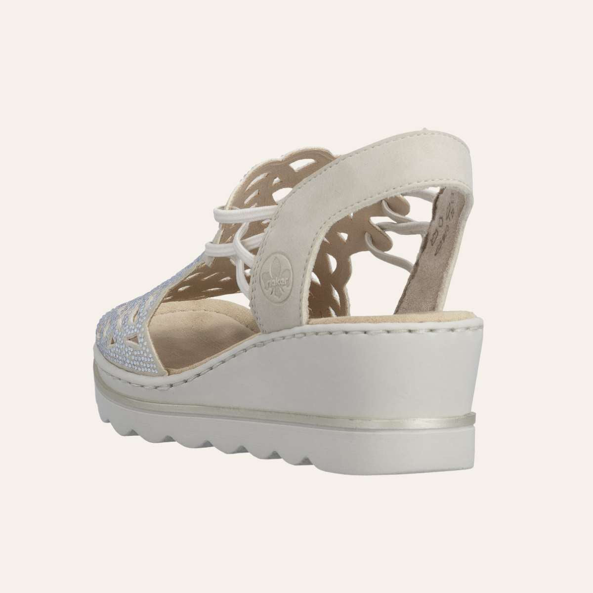 De elastiske detaljene gjør sandalen enkel å ta på og gir en god passform. Den myke sålen med Rieker Antistress gir god demping, mens kilehælen på ca. 5 cm gir et behagelig løft.