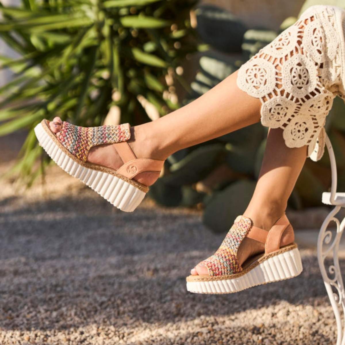 Disse flerfargede Rieker kilehælsandalene kombinerer stilig design med høy komfort og funksjonalitet. Takket være den flettede sålekonstruksjonen er skoen både slitesterk og fleksibel.