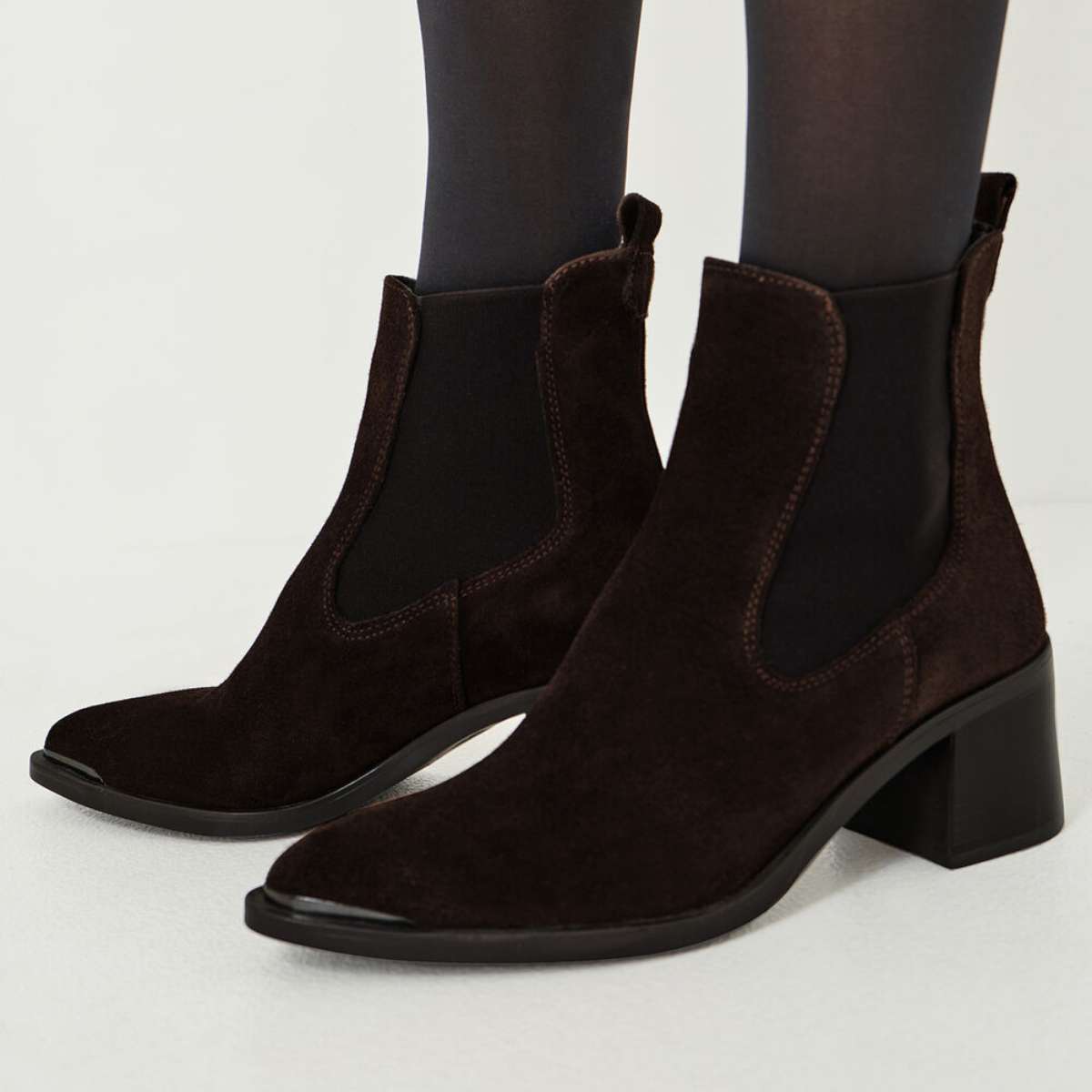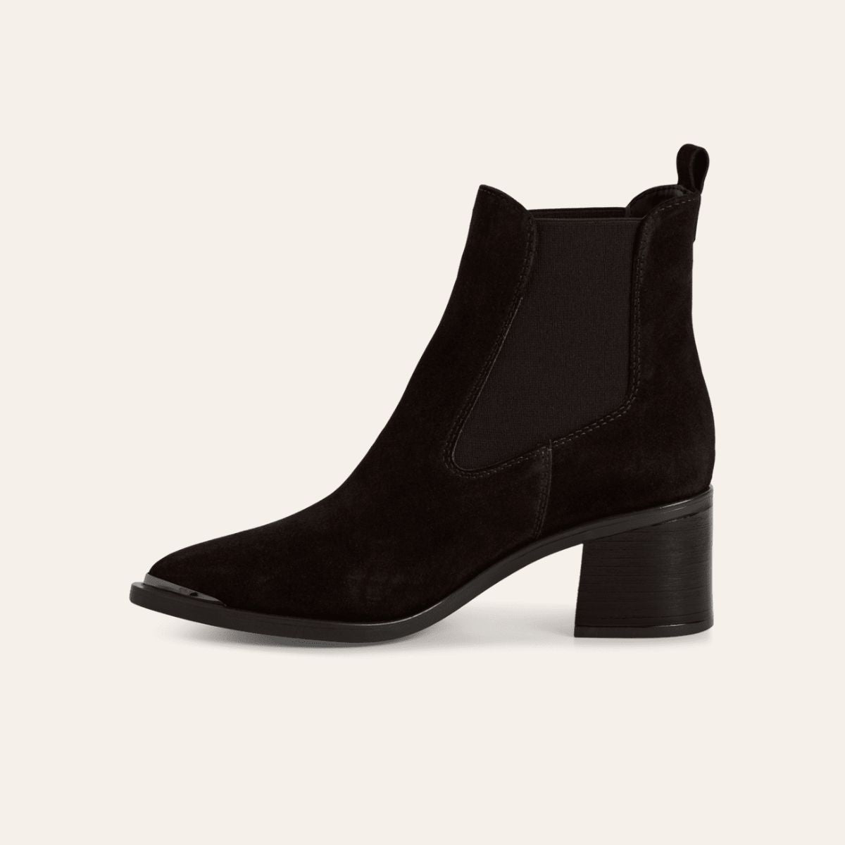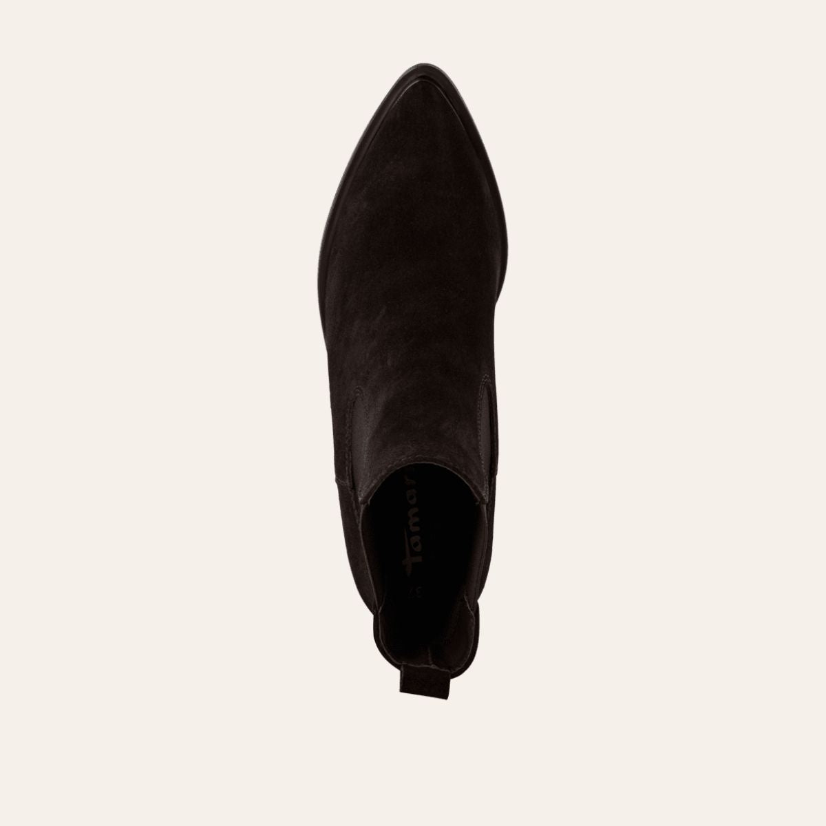 Elegant og moderne – denne stilrene støvletten fra Tamaris kombinerer klassisk Chelsea-design med en markant hæl og moderne detaljer. Den dype brune fargen og det myke semskede skinnet gir et sofistikert uttrykk, mens metallspissen foran tilfører et trendy, edgy preg.