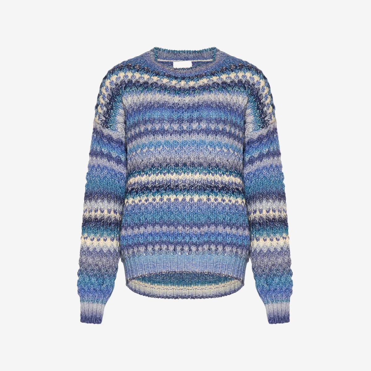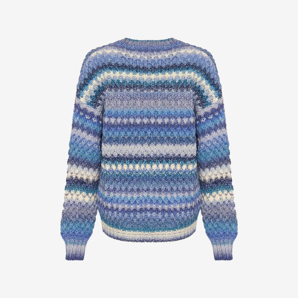 Gio Knit Sweater er en løs genser laget av 53 ull. Hvert plagg er unikt på grunn av garnets fargeprosess, noe som kan gi små variasjoner mellom produktene. Den har ballongermer.