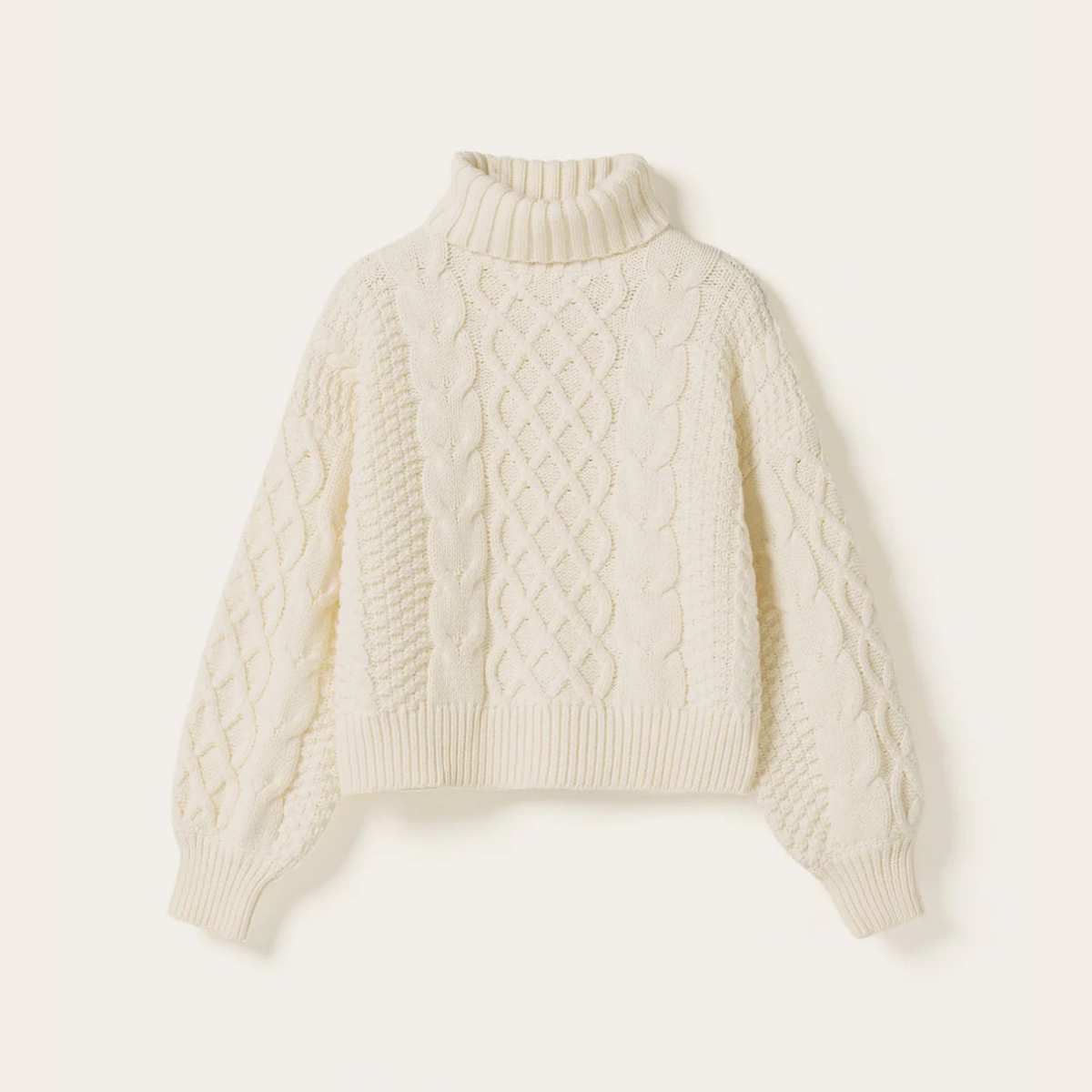 Lael Knit er en klassisk høyhalset strikkegenser med et rikt flettestrikkmønster og en lett cropped og løs passform.
