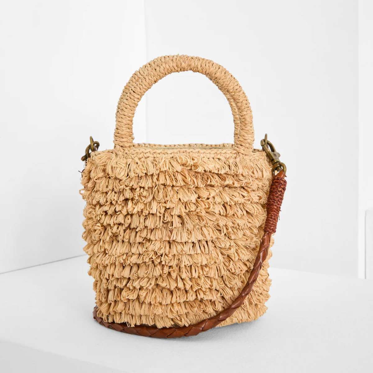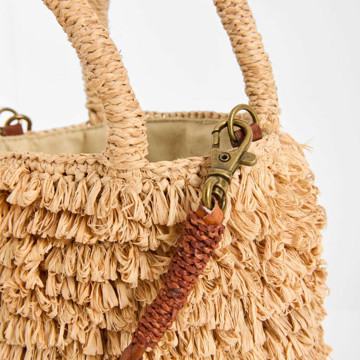 Materialer: 100 % naturlig raffia. Avtakbar rem i vegetabilsk garvet, flettet zebuskinn.