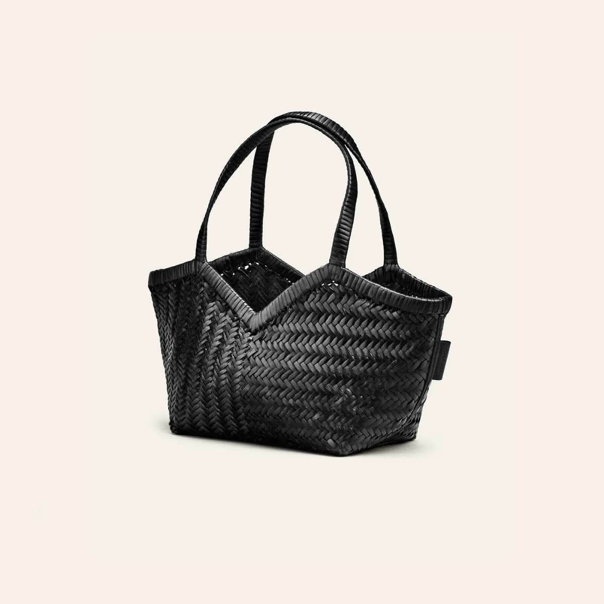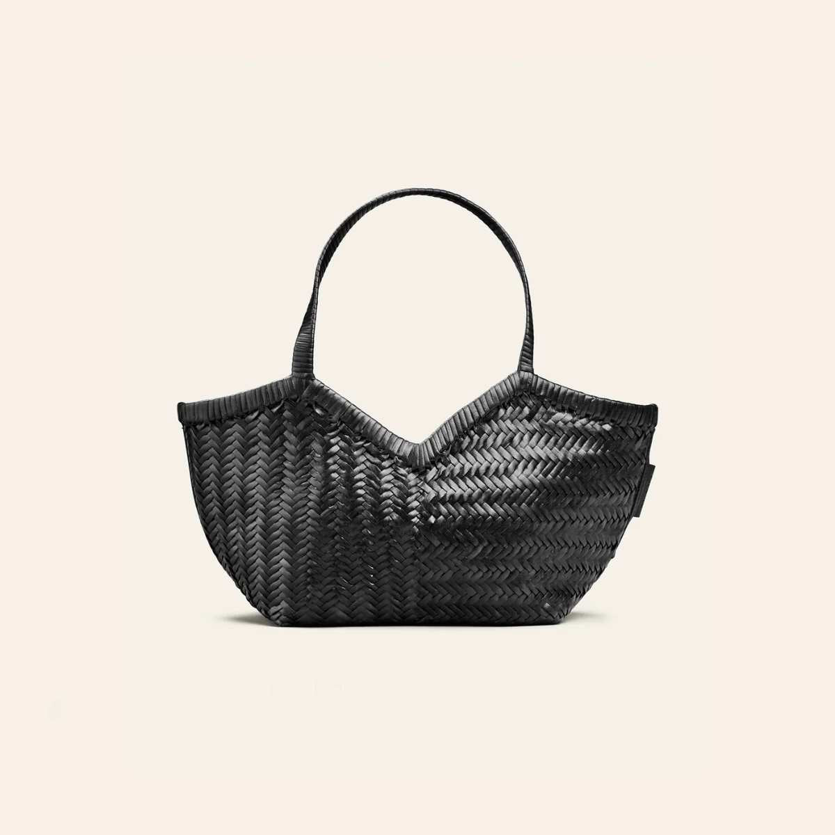 HUMI S fra Cala Jade er en liten skinnveske laget for å bære det viktigste – og litt mer. Håndflettet av bøffelskinn, og tilgjengelig i tre størrelser og flere fargealternativer. Den har et v-formet utsnitt på toppen og slanke håndtak som gjør den behagelig å bære på skulderen.