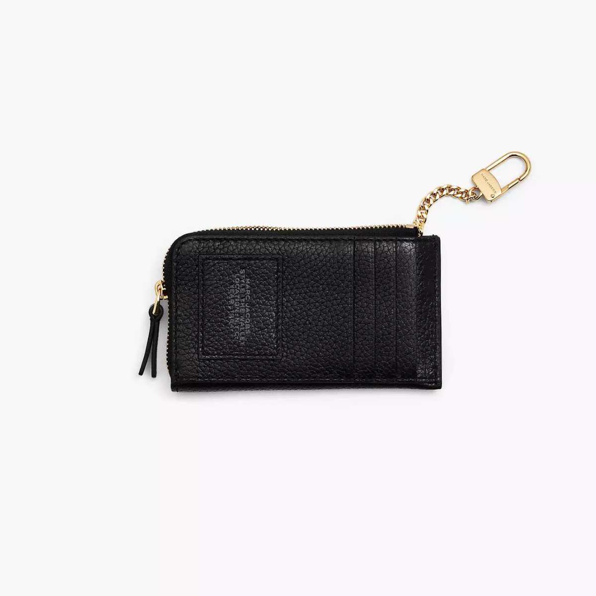 Denne lommeboken i skinn er designet med samme dristige merkevarebygging som Marc Jacobs sin bestselgende veske. Lommeboken lukkes med glidelås og har fire kortplasser, to innvendige lommer og et kjede med hundeklemme som kan brukes til nøklene dine.