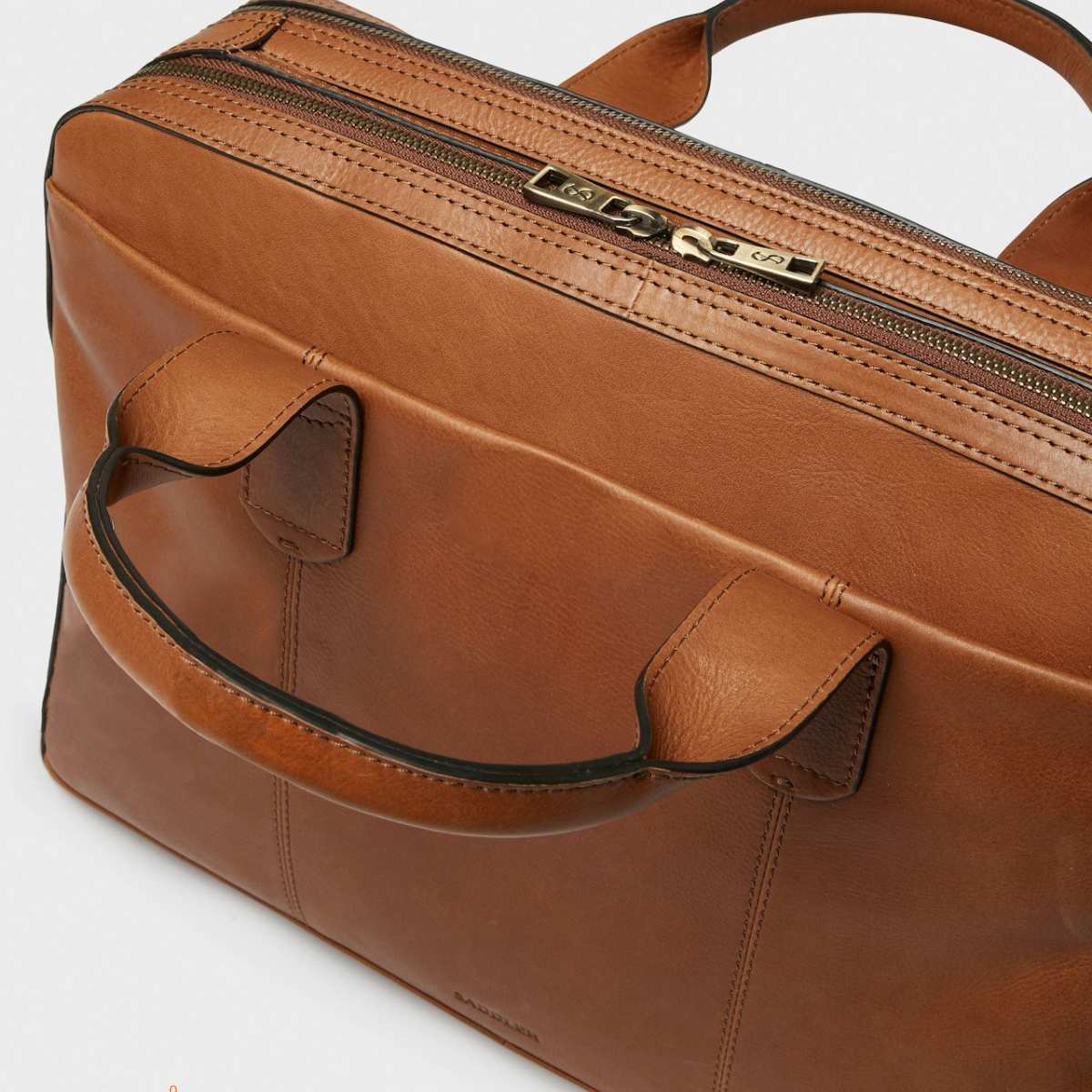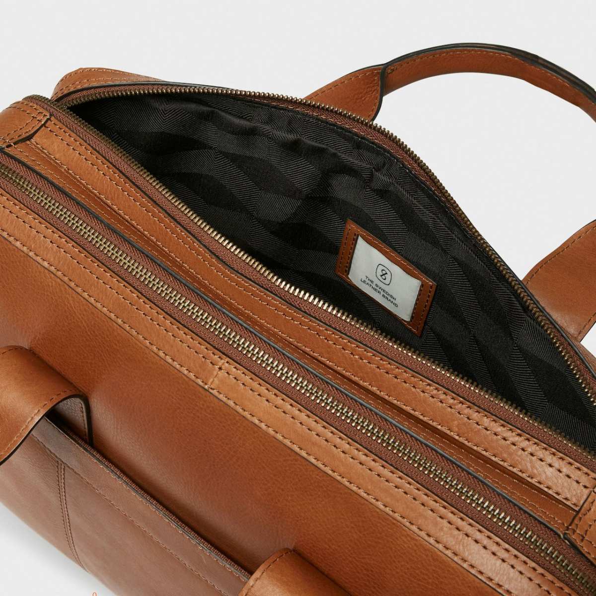 Dataveske Noret fra Saddler. En høykvalitets og slitesterk dataveske laget av full grain-lær. Vesken har to vatterte hovedrom. Det fremre rommet har en toveis glidelås i metall, og det andre rommet har en vanlig glidelås. I midten finnes en ekstra slip-in lomme, og vesken har også dobbelvattert bunn. Datavesken rommer en 15" eller 16" laptop i alle rom. Noret er en stilig, klassisk veske som kan brukes som dataveske og portefølje, og passer perfekt til jobben. Vesken har en slip-in lomme med magnetlås på forsiden, lærhåndtak og trillebånd på baksiden. Innvendig har vesken en mindre lomme med glidelås, elastiske holdere for penner og en slip-in lomme. Datavesken har en avtagbar og justerbar vevd skulderrem med en lengde på maks 130 cm og min 87 cm. Spenne av børstet messingfarget metall. Læret i dette produktet er av høyeste kvalitet og har blitt behandlet i et garveri sertifisert av Leather Working Group.