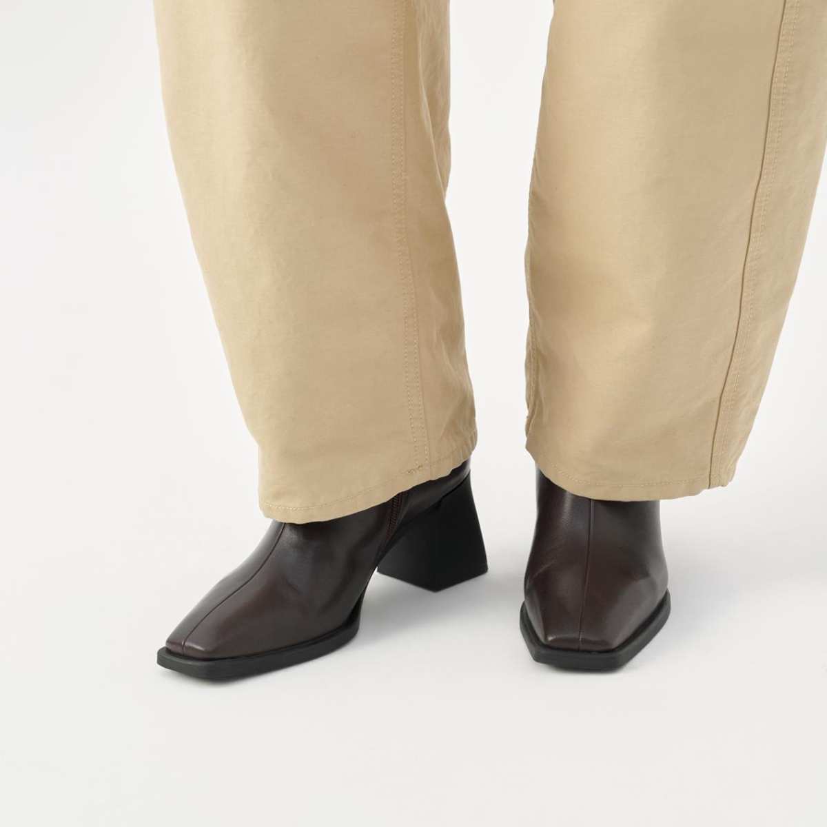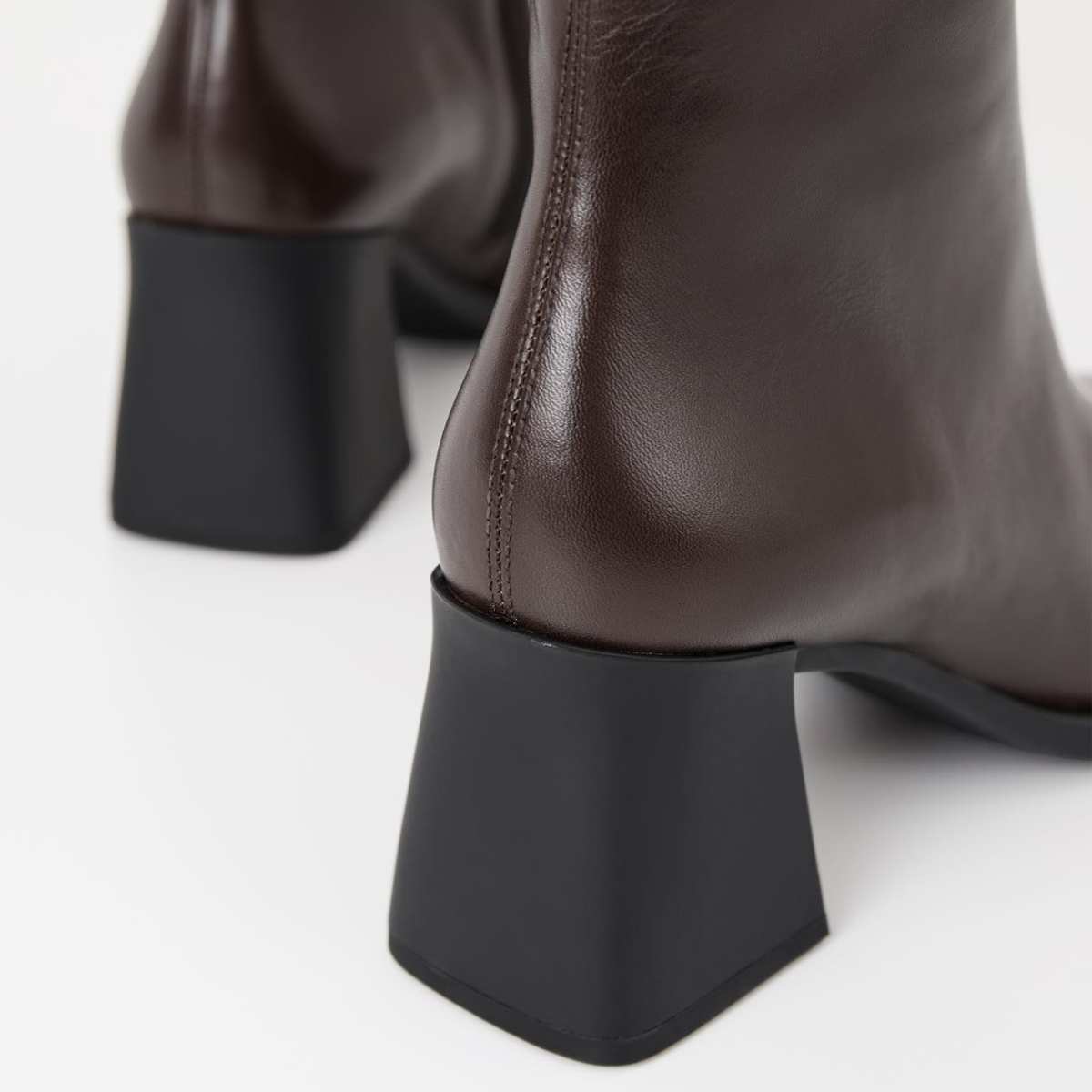 Vagabond Edition Hedda har et tidløst design. Modellen er laget i mørkebrunt skinn og har en subtilt firkantet tåform. Detaljer inkluderer en midtsøm, glidelås langs innsiden av skaftet og en 70 mm utsvingt hæl. Innersålen er i kromfritt skinn.