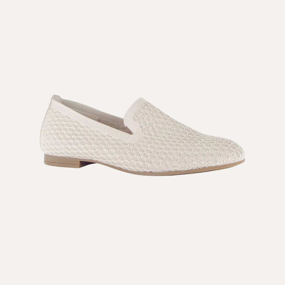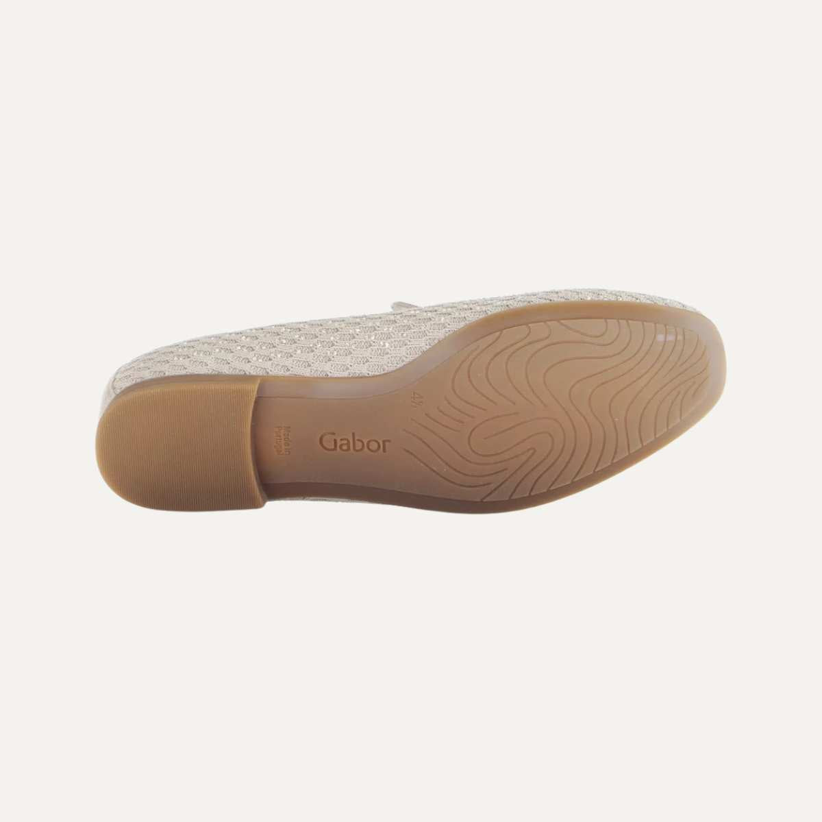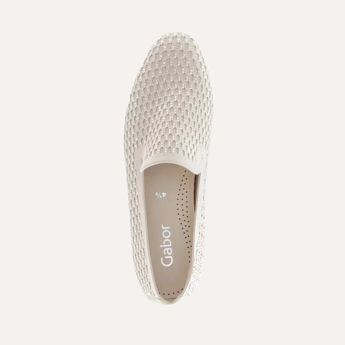 Stilren slip‑on i beige tekstil med rund tå og klassisk design – perfekt for både jobb og fritid. Myk tekstilfôr og lav profil gir god komfort, mens den enkle silhuetten gjør denne slipperen lett å kombinere med alle antrekk. Klassisk kvalitet fra Gabor. Glitterdetaljer på toppen.