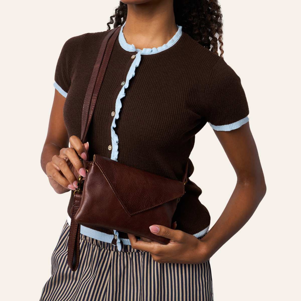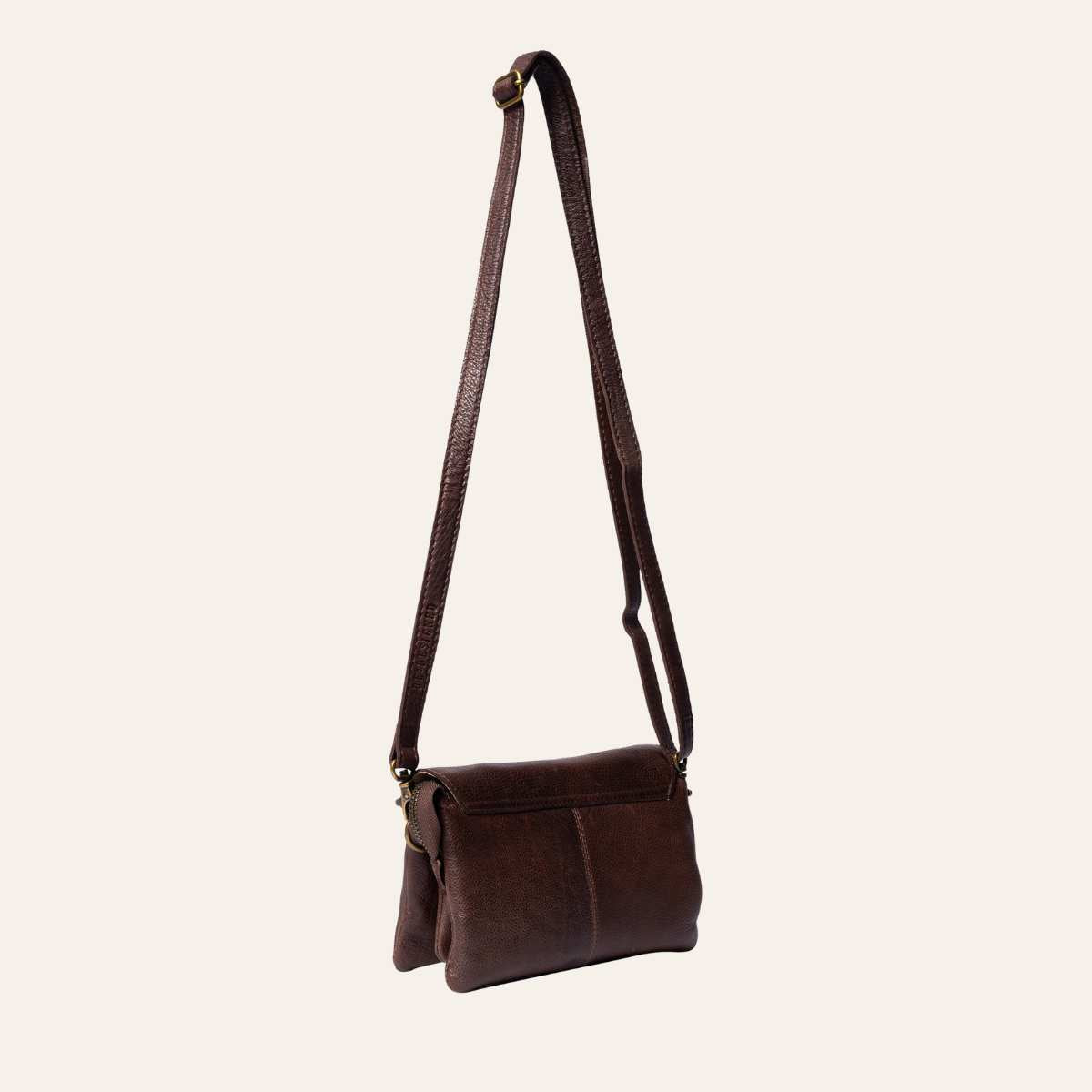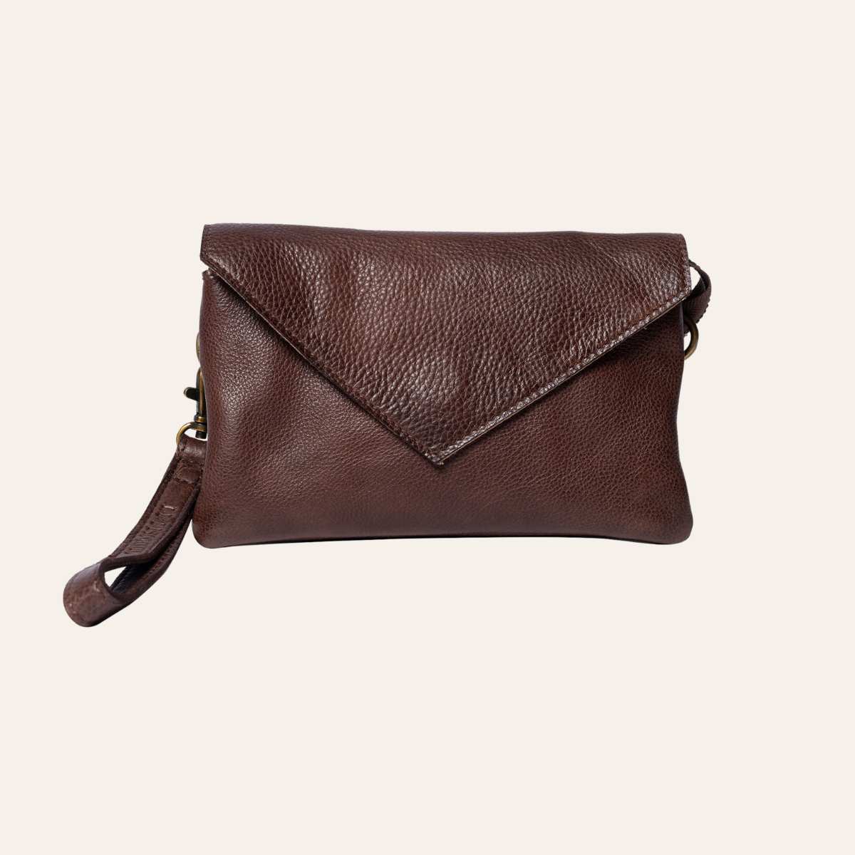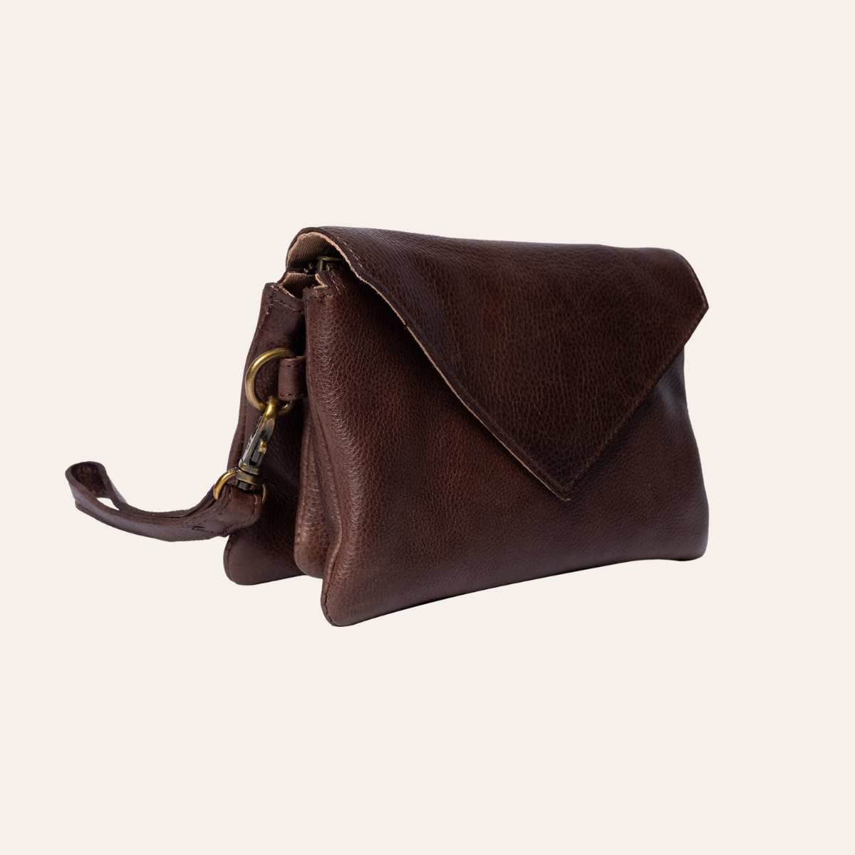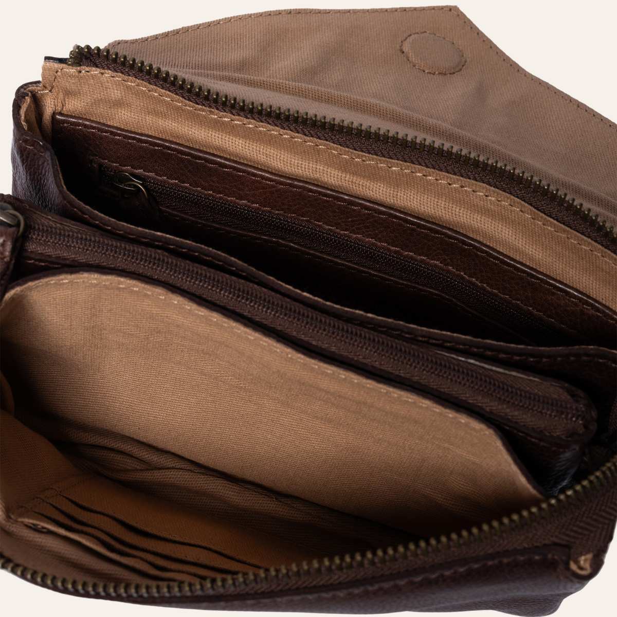 Liten clutch fra Redesigned by Dixie. Vesken lukkes med glidelås og klaff. Vesken er delt inn i et stort rom med to mindre innerlommer for enhver mobil. samt en lomme som lukkes med glidelås.