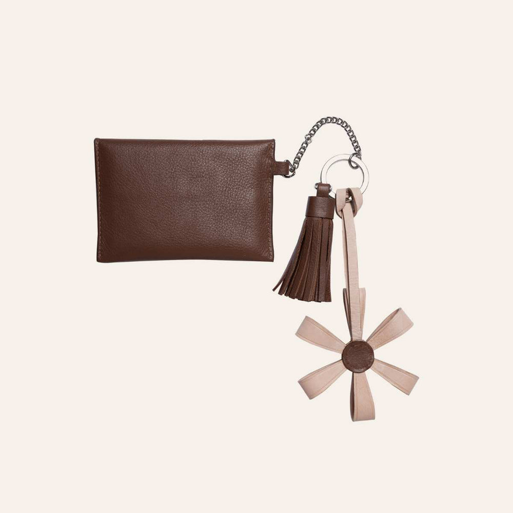 Nela er en liten og stilfull nøkkelring i 100 % skinn, perfekt til hverdagsbruk. Den er håndlaget og kombinerer funksjon med dekorative detaljer som gir et personlig preg.