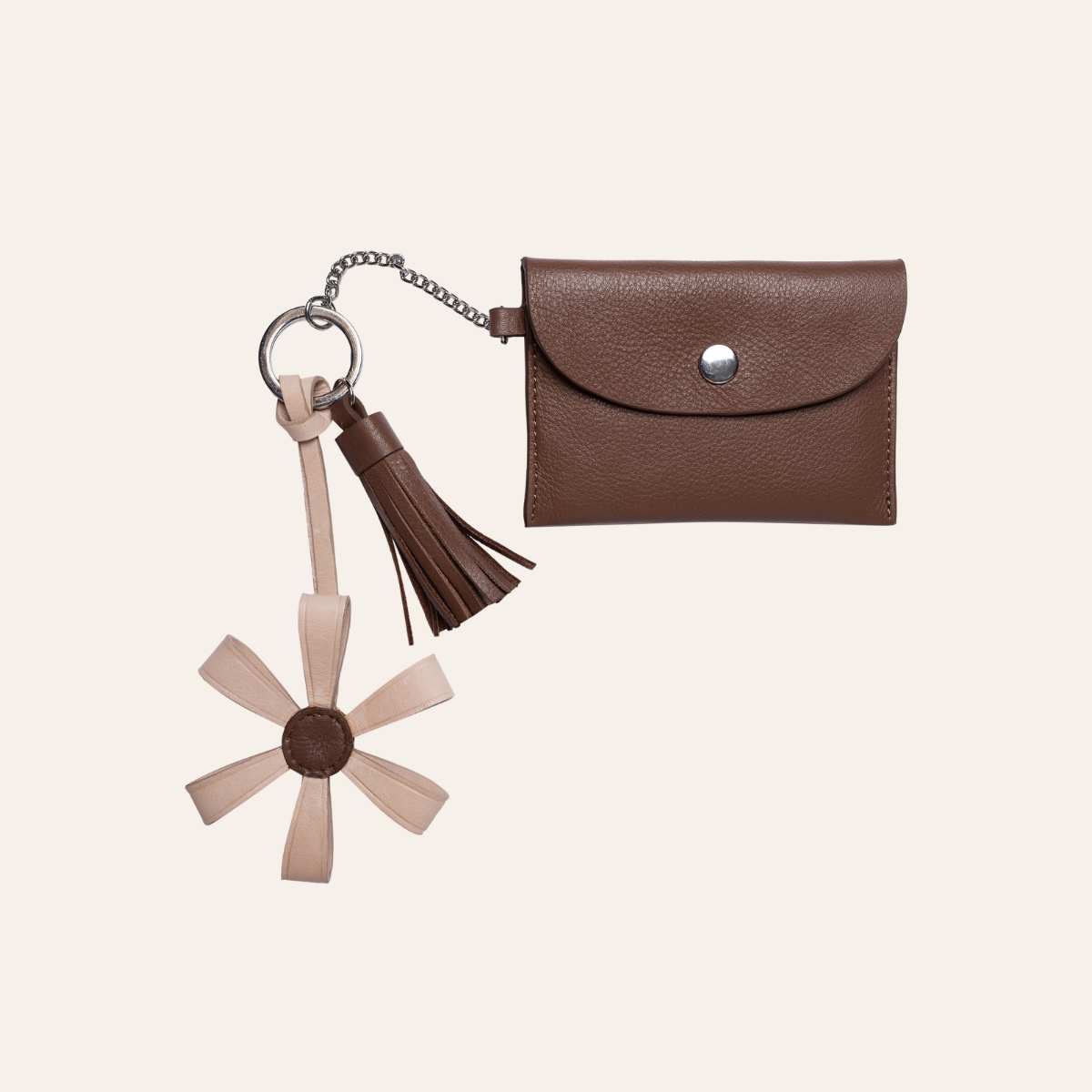 Designet består av en elegant tassel, en dekorativ blomst og en liten pung med knappelukking – praktisk for små mynter eller andre småting du vil ha lett tilgjengelig.