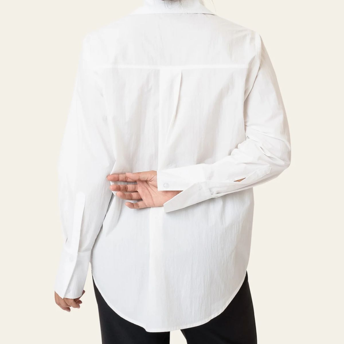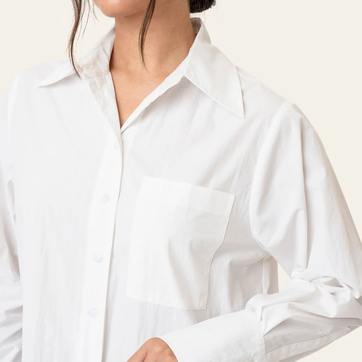 En tidløs hvit skjorte laget av et skarpt materiale med en subtil teksturert overflate. Designet i en avslappet, oversized passform, har den en klassisk krage, knappelukking foran og en enkelt brystlomme for et uanstrengt, men raffinert utseende. Brede mansjetter og rene linjer gjør den til et allsidig must-have i garderoben – ideell for hverdagsbruk eller et elegant kontorantrekk.