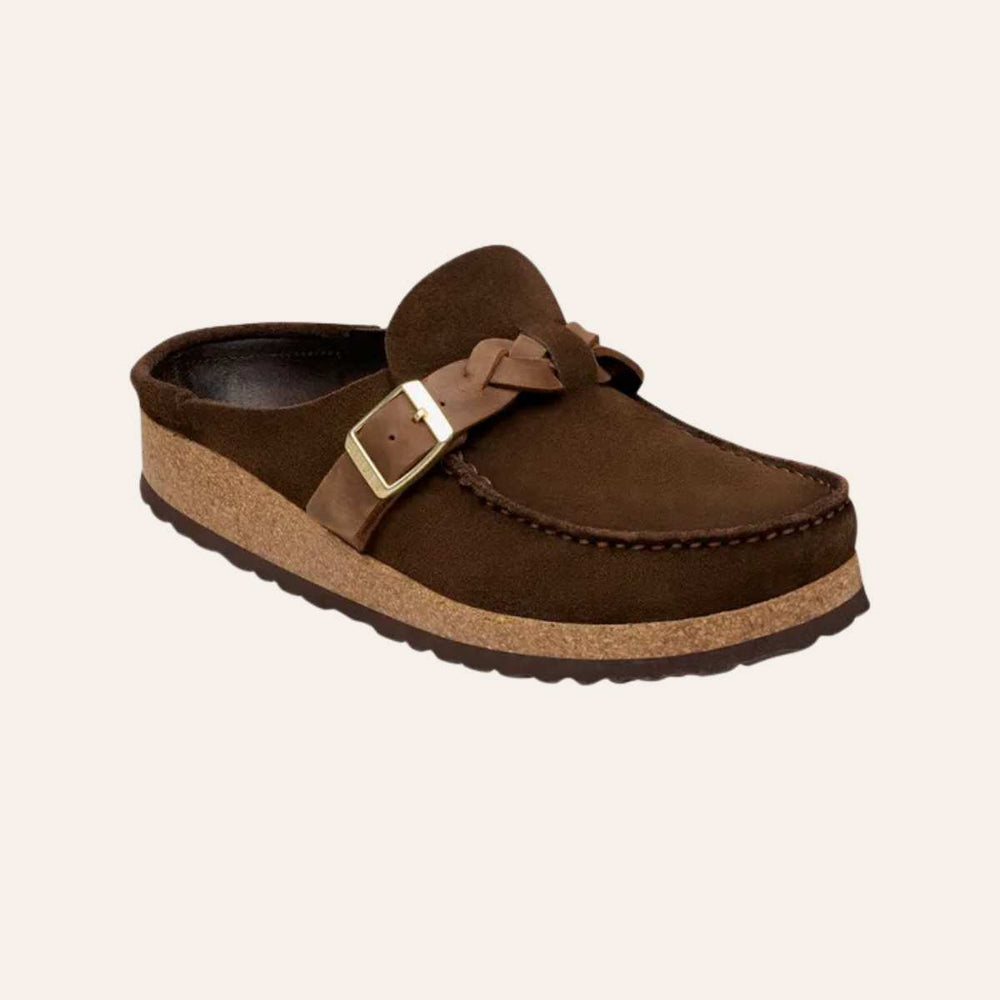 BIRKENSTOCK Buckley er en halvåpen tresko i mokkasin-stil som umiddelbart gjenkjennes som en ekte BIRKENSTOCK-original, takket være den tykke korksålen. De markante sømmene fanger blikket. Denne modellen kommer med en spesiell detalj: remmene har et flettet mønster, noe som gjør dem til et perfekt valg for trendy boho-stiler. Det naturlige uttrykket skyldes overdelen i ekstra mykt semsket skinn som former seg etter foten som en andre hud.