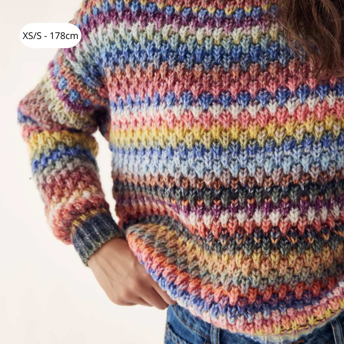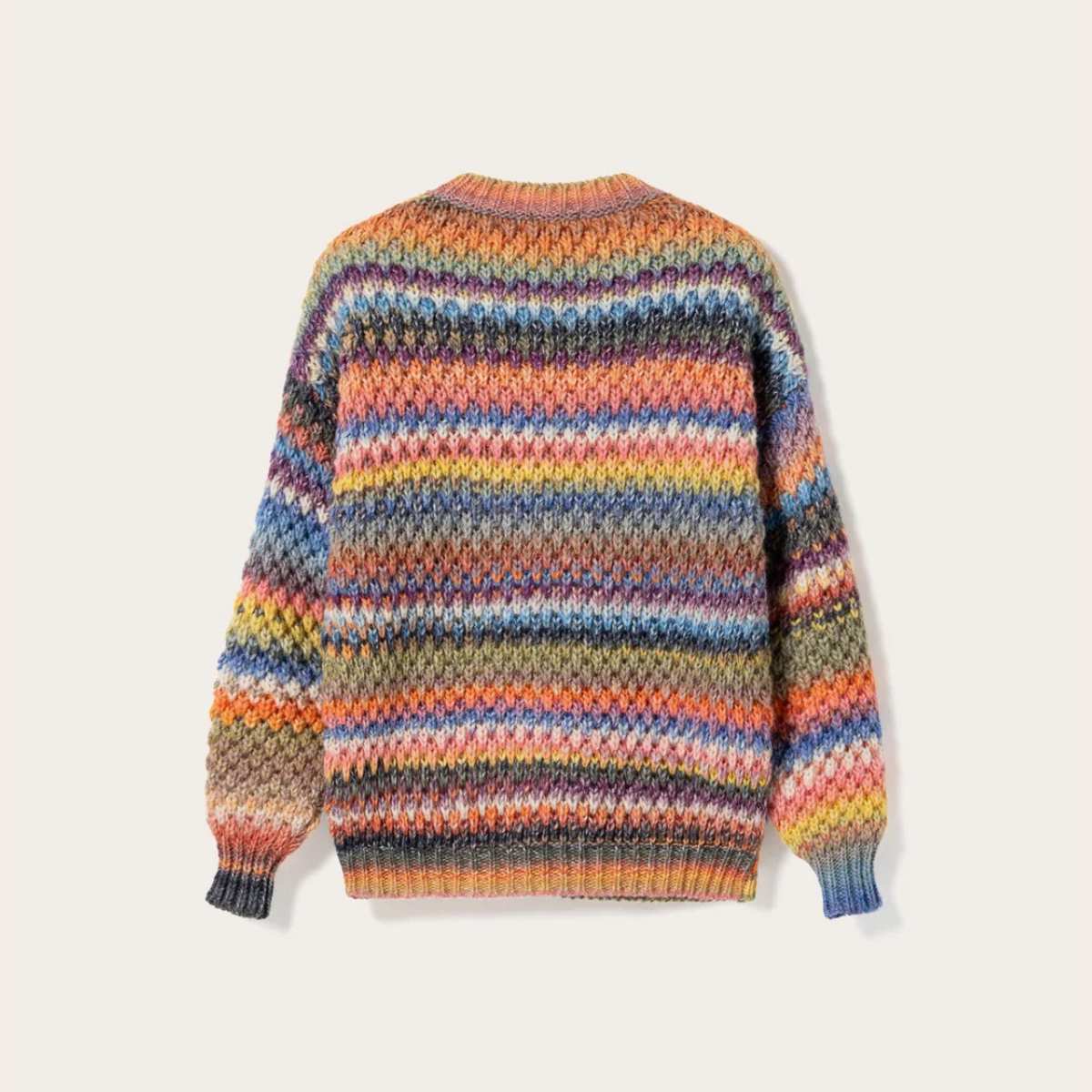 Gio Knit Sweater er en løs genser laget av 53 ull. Hvert plagg er unikt på grunn av garnets fargeprosess, noe som kan gi små variasjoner mellom produktene. Den har ballongermer.