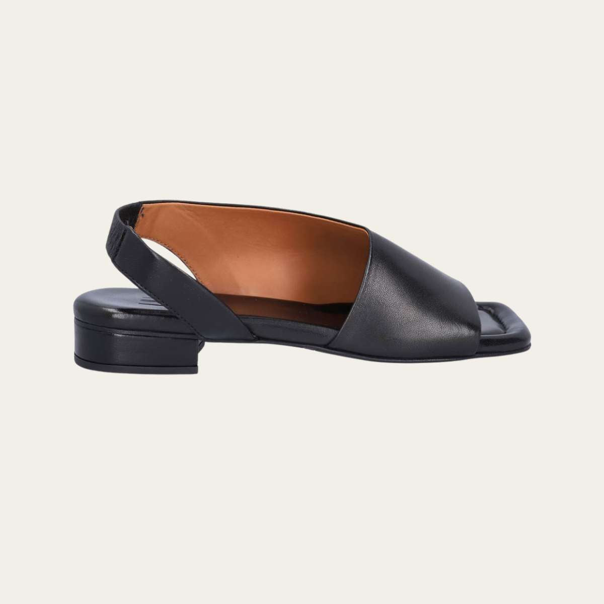 Elegant og stilren håndlaget sandal i sort glatt skinn, produsert i Portugal. Modellen har en moderne, firkantet tå og asymmetrisk design som gir et sofistikert og oppdatert uttrykk.