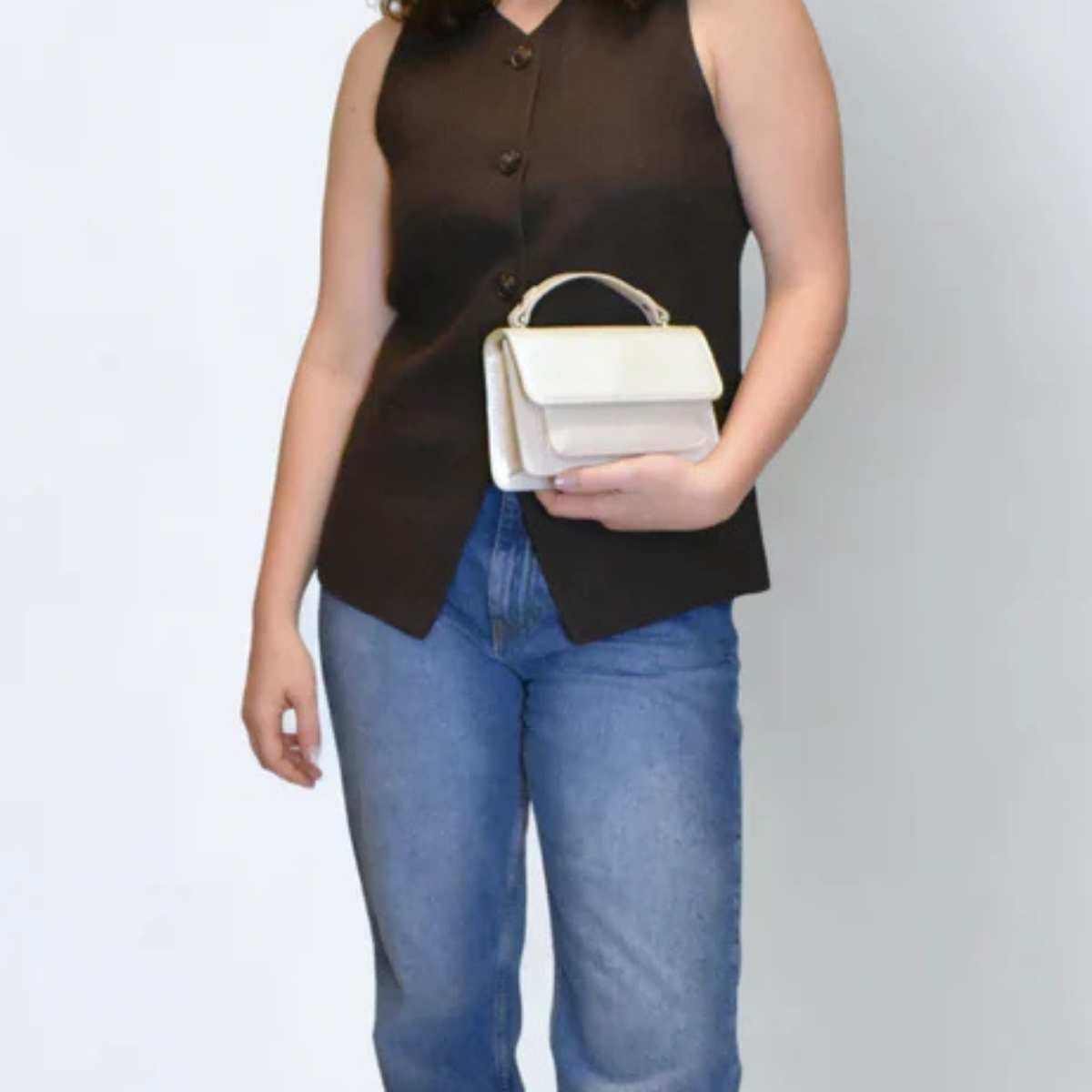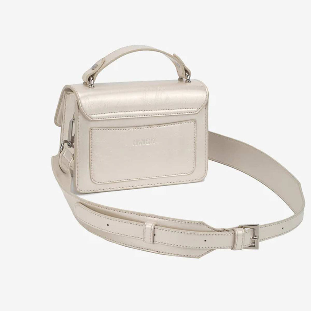 Stilren mini veske fra Hvisk med moderne design og praktiske detaljer. Vesken har et kort håndtak og en avtakbar, justerbar crossbody-rem, slik at du kan bære den både i hånden og over skulderen.