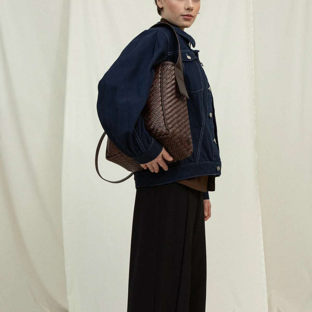 Cala Jade Iwa. Kvalitetsvesker med det lille ekstra. Laget for å vare - Iwa er tidløs og uanstrengt. Den firkantede vesken er en hverdagslig følgesvenn som bærer datamaskinen og mer. Vevingen av lær gir tekstur og holder formen. Bred slip-in lomme på innsiden.