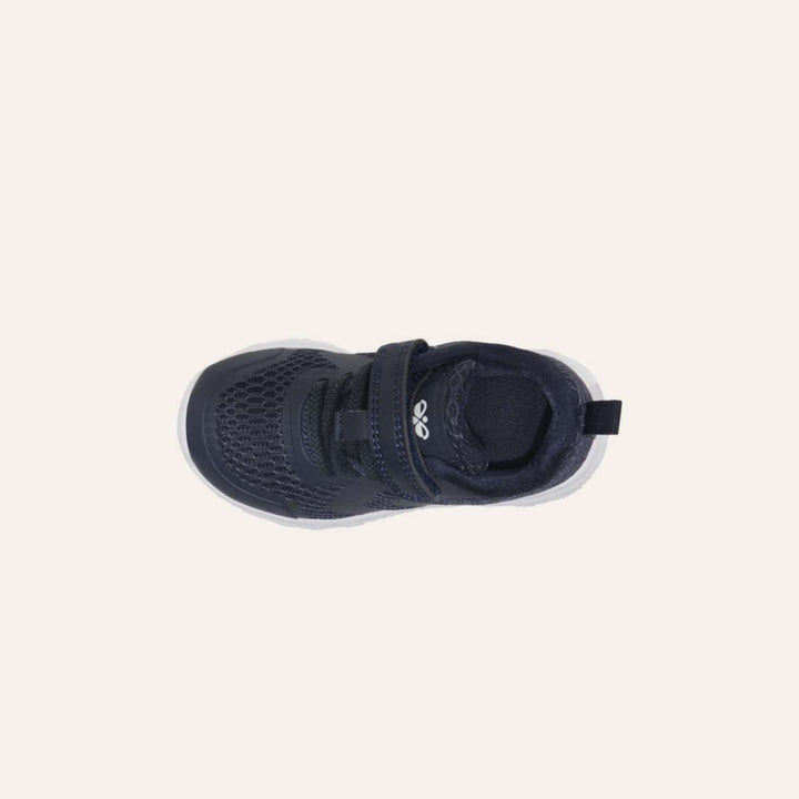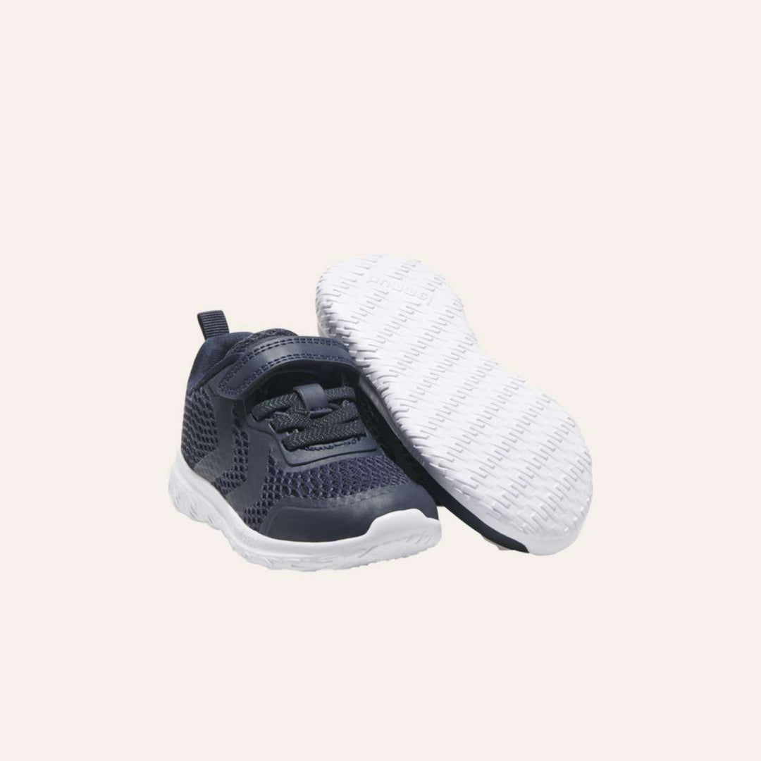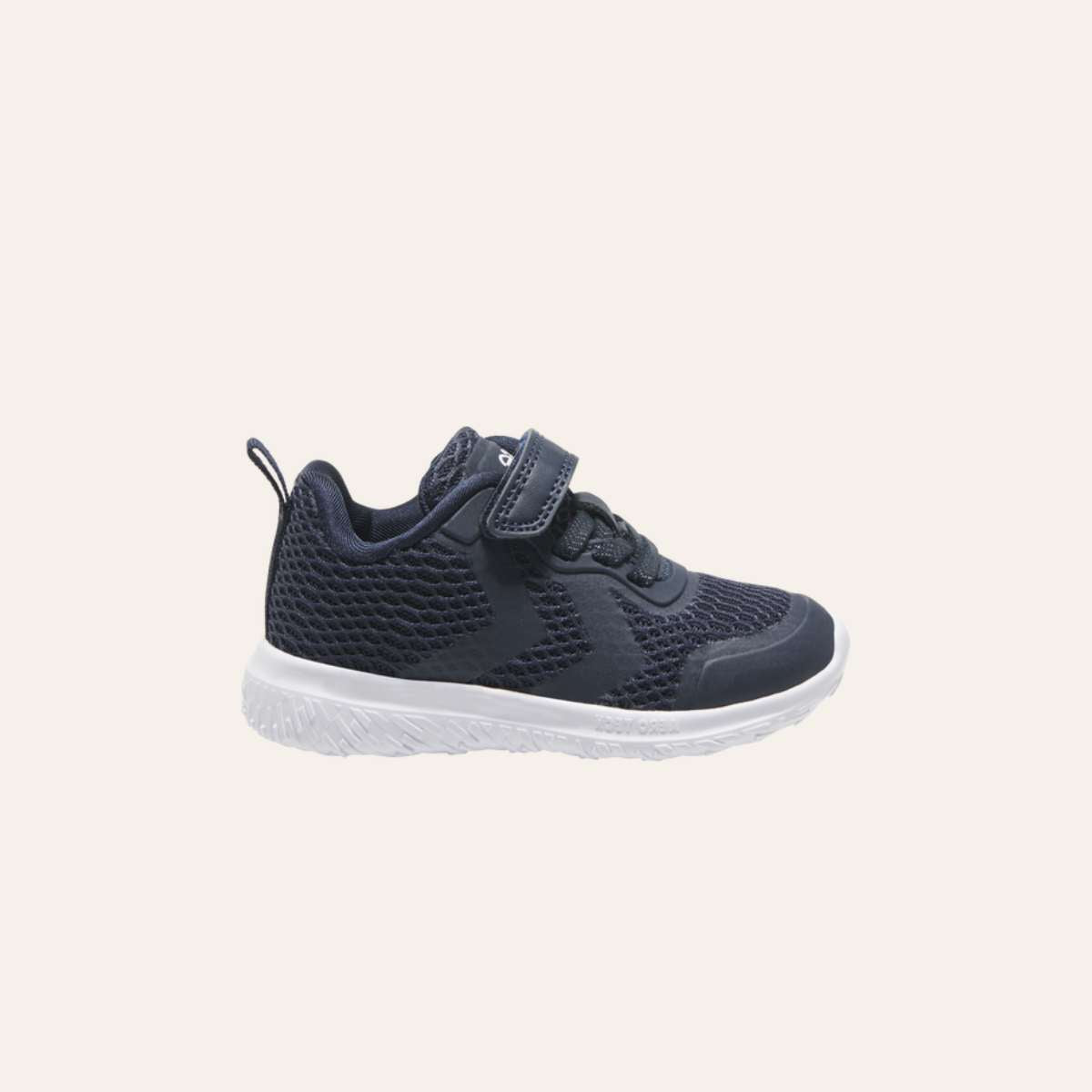 La den lille løpe fritt i sine Hummel sine Actus sko, laget med en lett og fleksibel Aerotech EVA-såle og mesh-overdel. Disse skoene er laget av resirkulerte materialer, og har signatur chevrons på sidene.